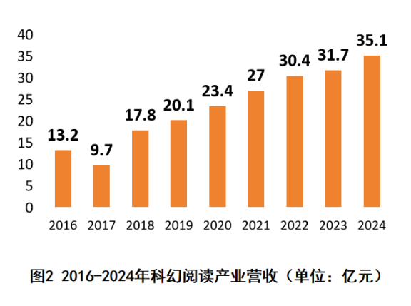 1.中国科幻阅读产业2024年总营收35.1亿元,同比增长10.7%。2017至2024年连续保持增长态势。科幻新书码洋贡献率明显提升,科幻数字阅读和有声阅读进入发展快车道。